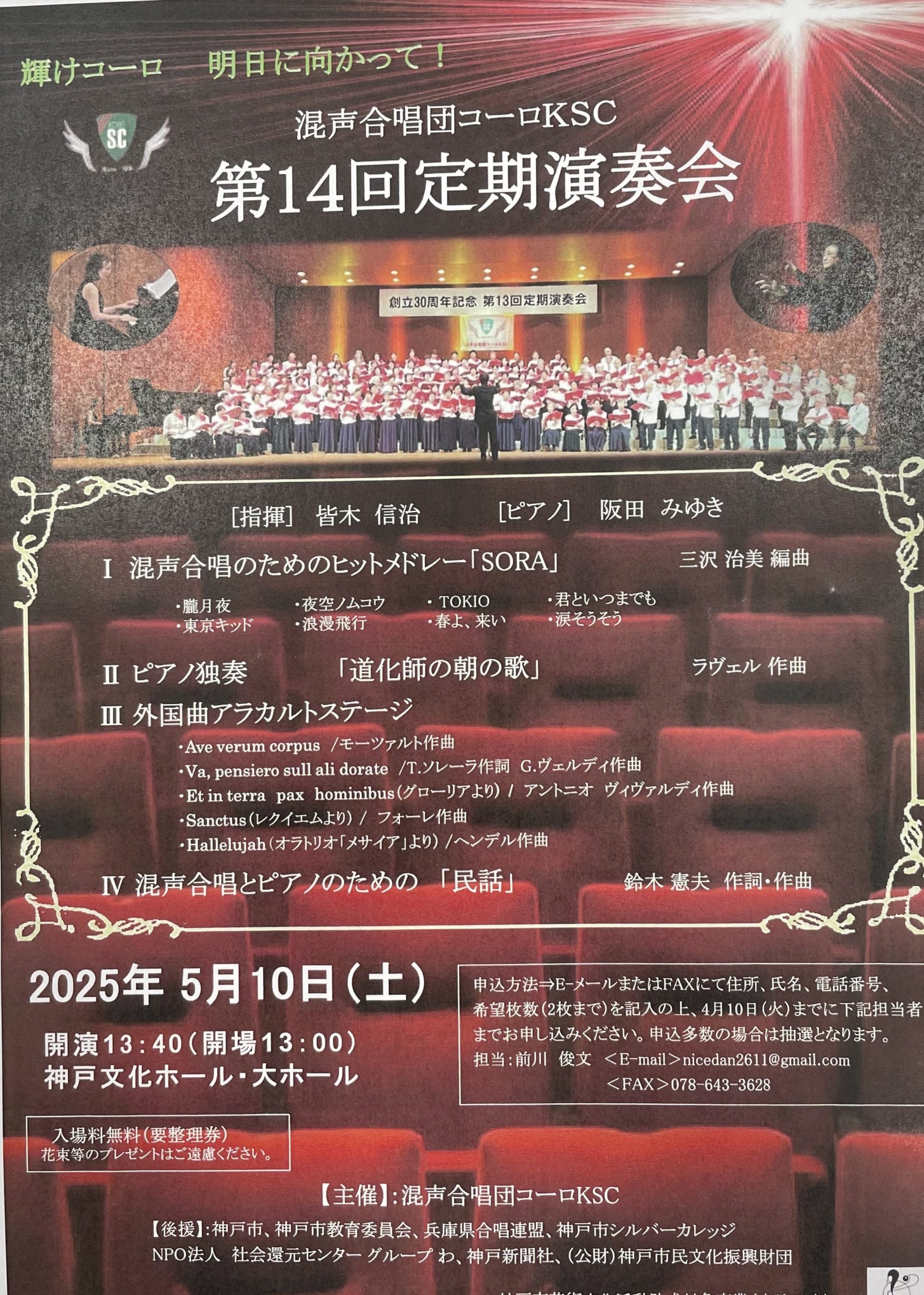 5月10日(土)、当施設「ぽー愛」にボランティアでお越しくださった混声合唱団コーロKSCが、神戸文化ホールにて演奏会を開催されます。 優しいハーモニーで心を和ませてくれた皆さんのステージを、ぜひご一緒に聴きに行きませんか? 会場:神戸文化ホール 時間:14時開演(13時30分開場) ご希望の方は、職員までお知らせください。